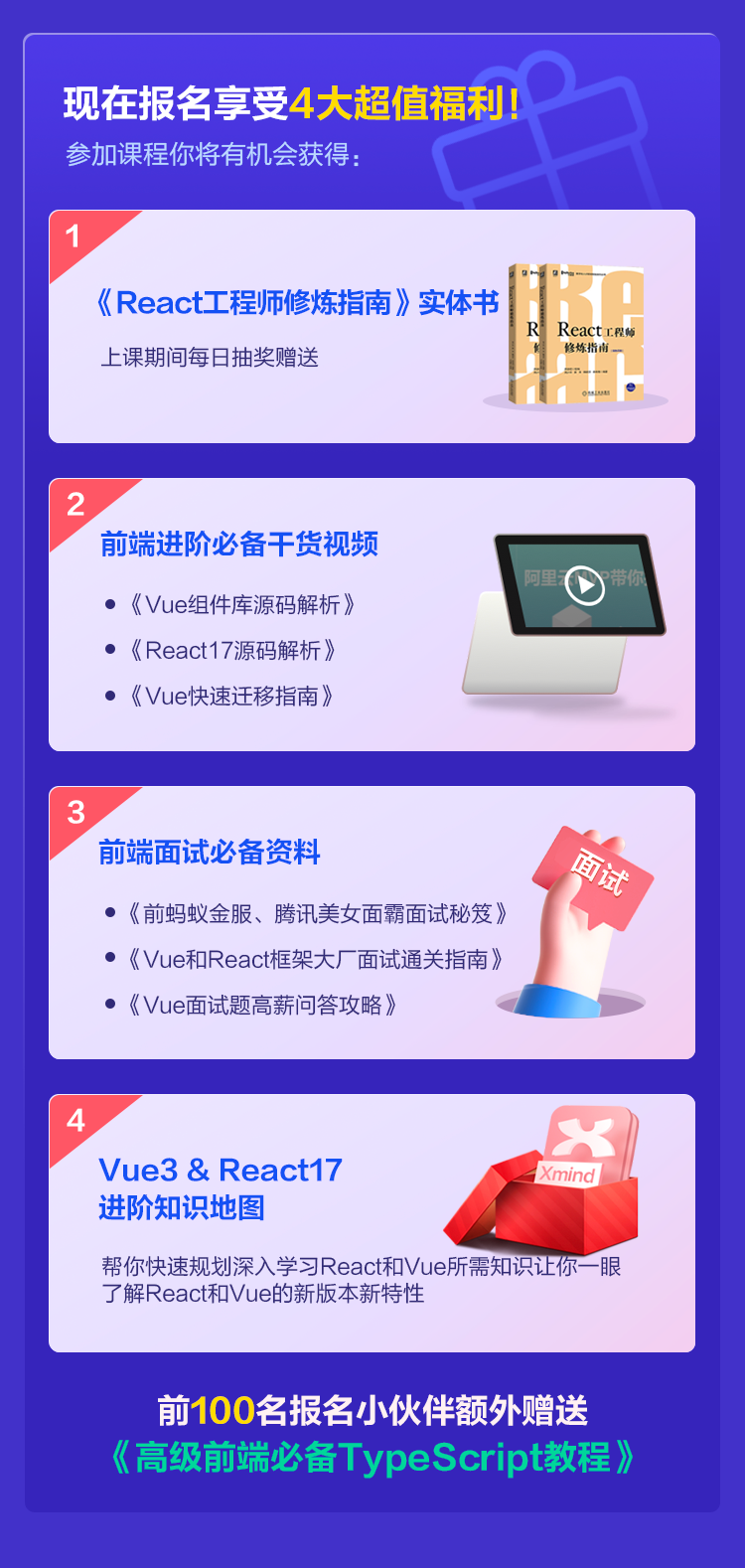 3天课程你不仅能深度掌握 Vue3 和 React17 设计思路,掌控面试;通过对比框架生态,掌握技术选型方法论,通过探究框架原理,构建前端核心竞争力,还会收获大圣老师精心总结的独家资料: