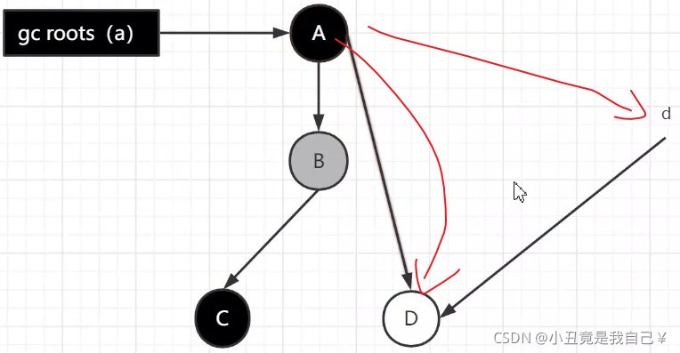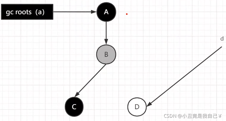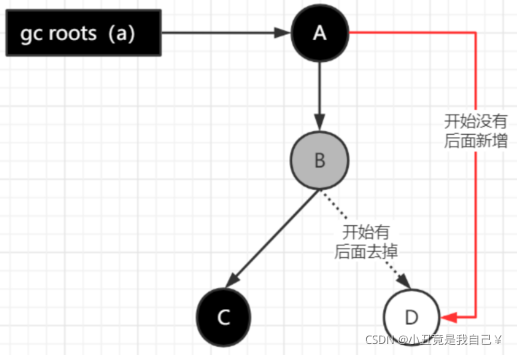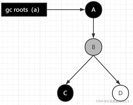 注意,在这一个时刻,Gcroots开始并发扫描,扫描到了A,并且扫描到了B,所以A变黑色,