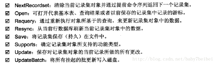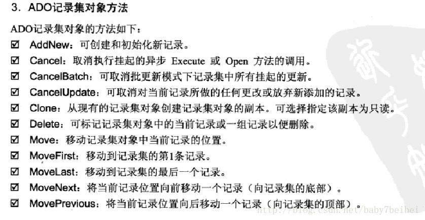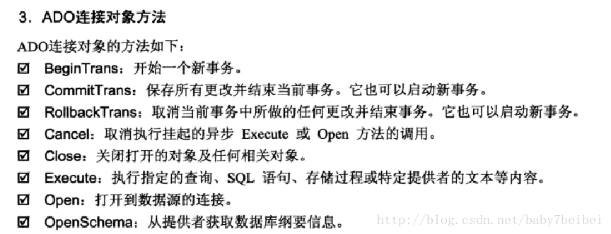 ADO的对象有七个,但是我在使用的过程中只使用过两个,一个是连接对象(connection)、一个是记录集对象(Recordset)。每个对象都有各自的方法对应各自的操作。主要的方法对应如下: