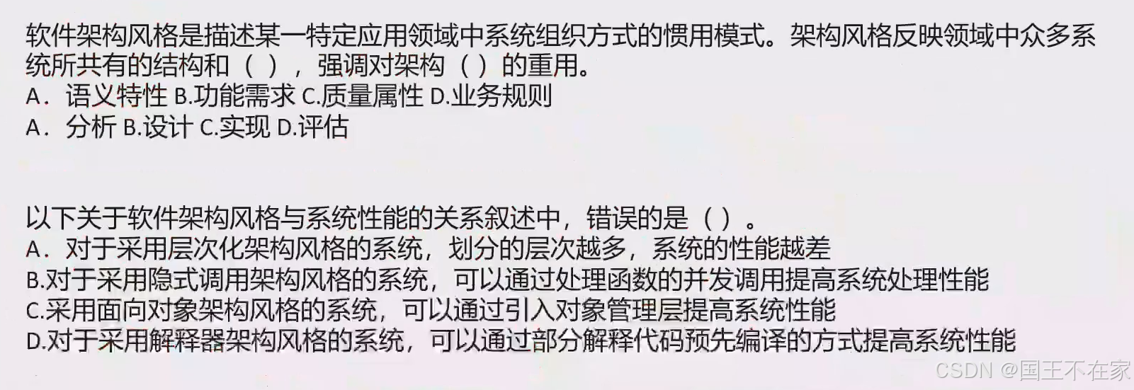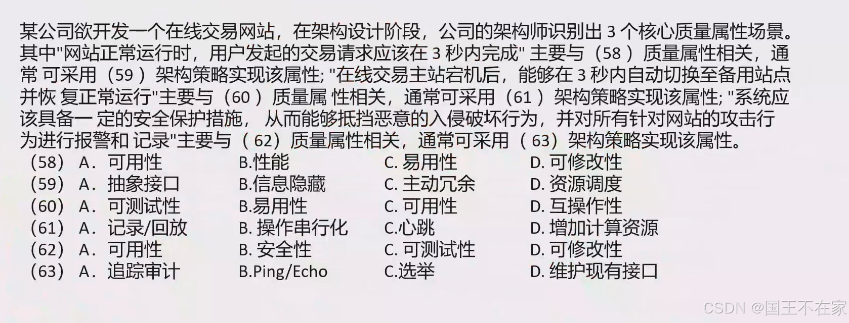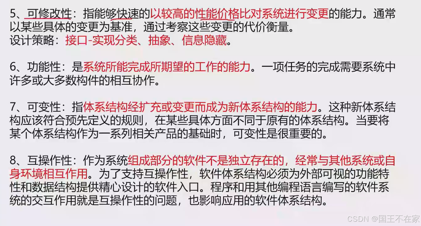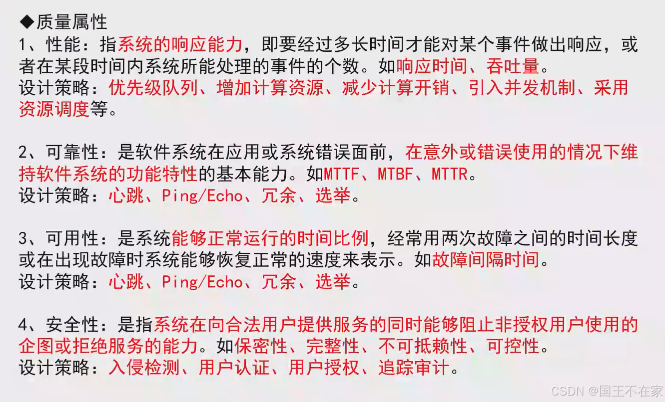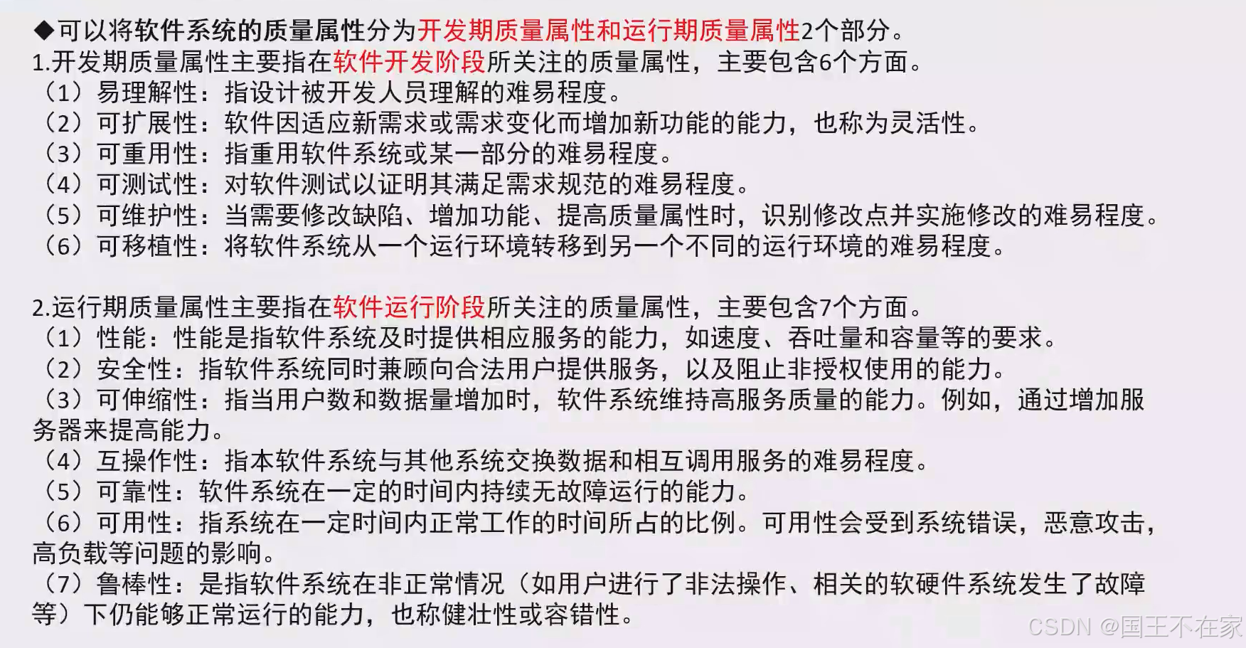 解析: 软件架构质量属性包含8个主要特性:性能、可靠性、安全性、可用性、兼容性、可维护性、功能适用性和可移植性。