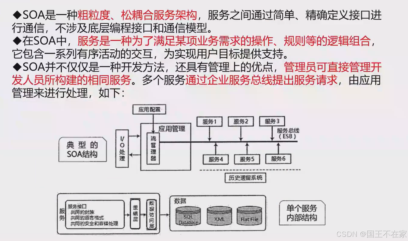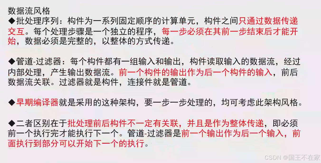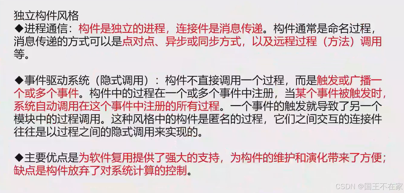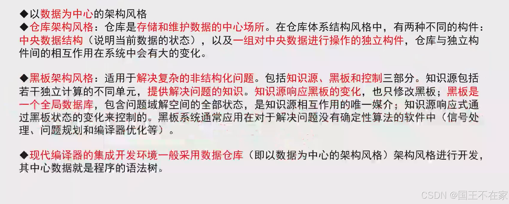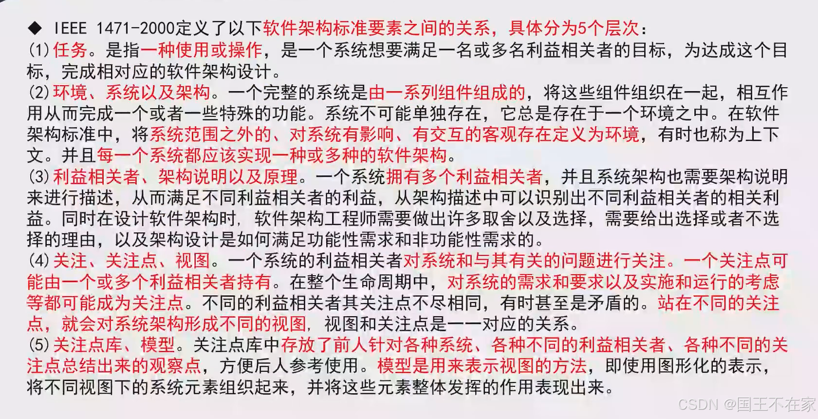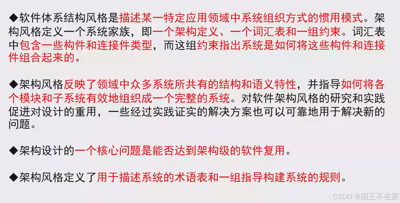 - 软件架构定义:软件架构为系统提供了一个结构、行为和属性的高级抽象,由构件的描述,构