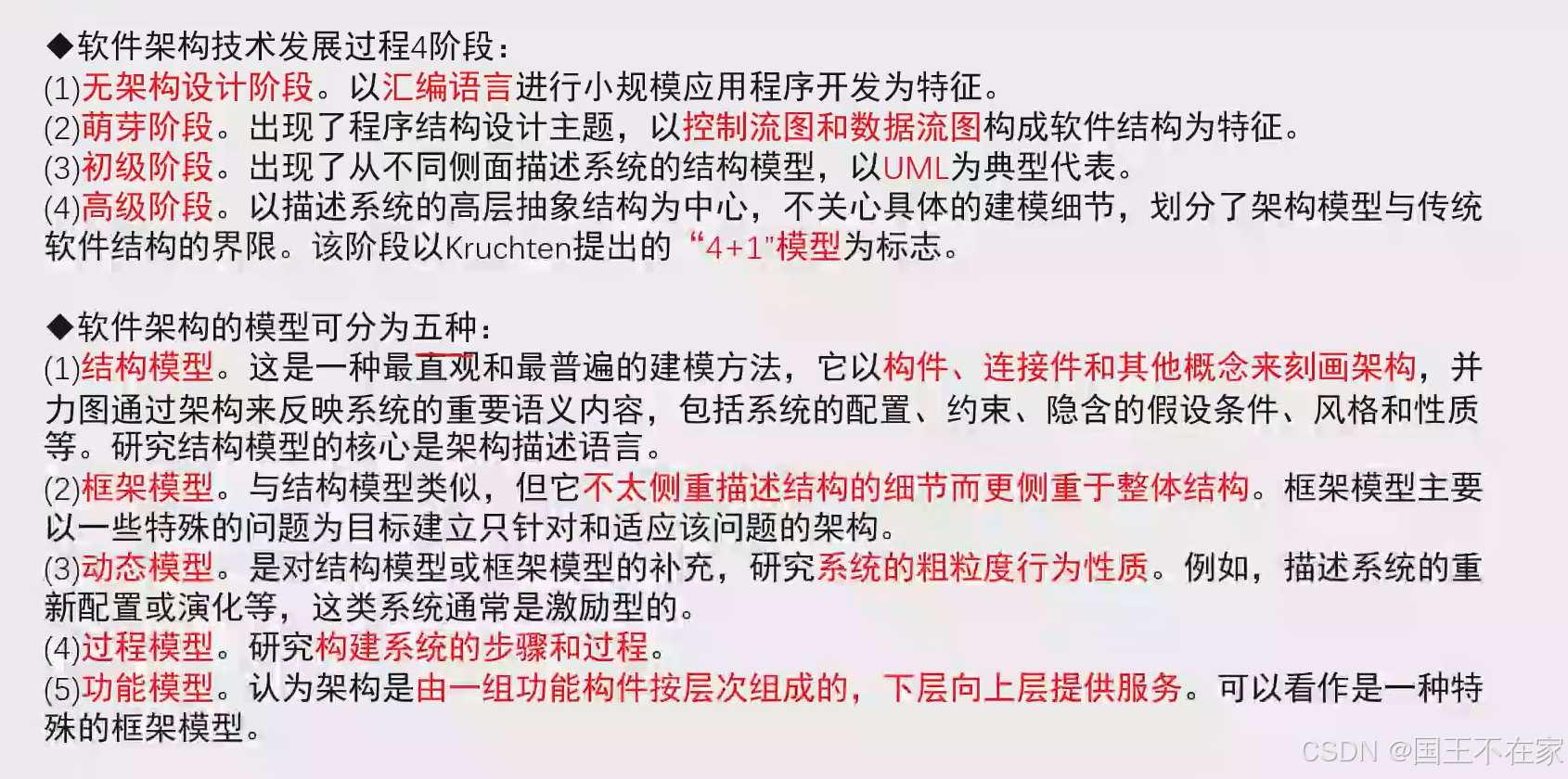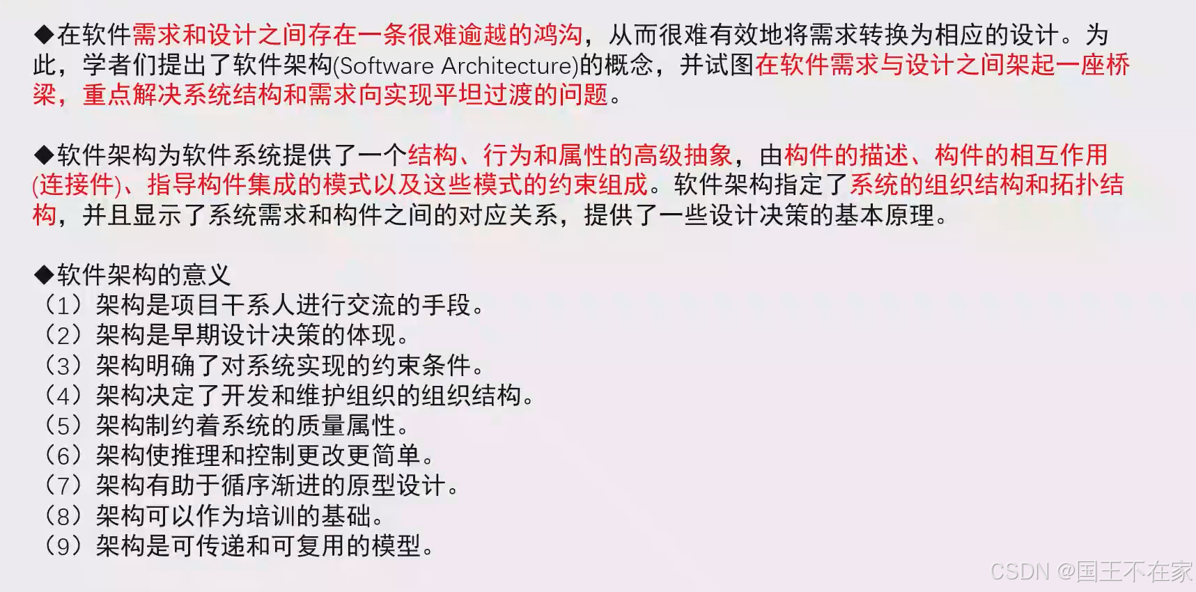 - 软件架构指定了系统的组织结构和拓扑结构,并且显示了系统需求和构件之间的对应关系,提供了一些设计决策的基本原理。