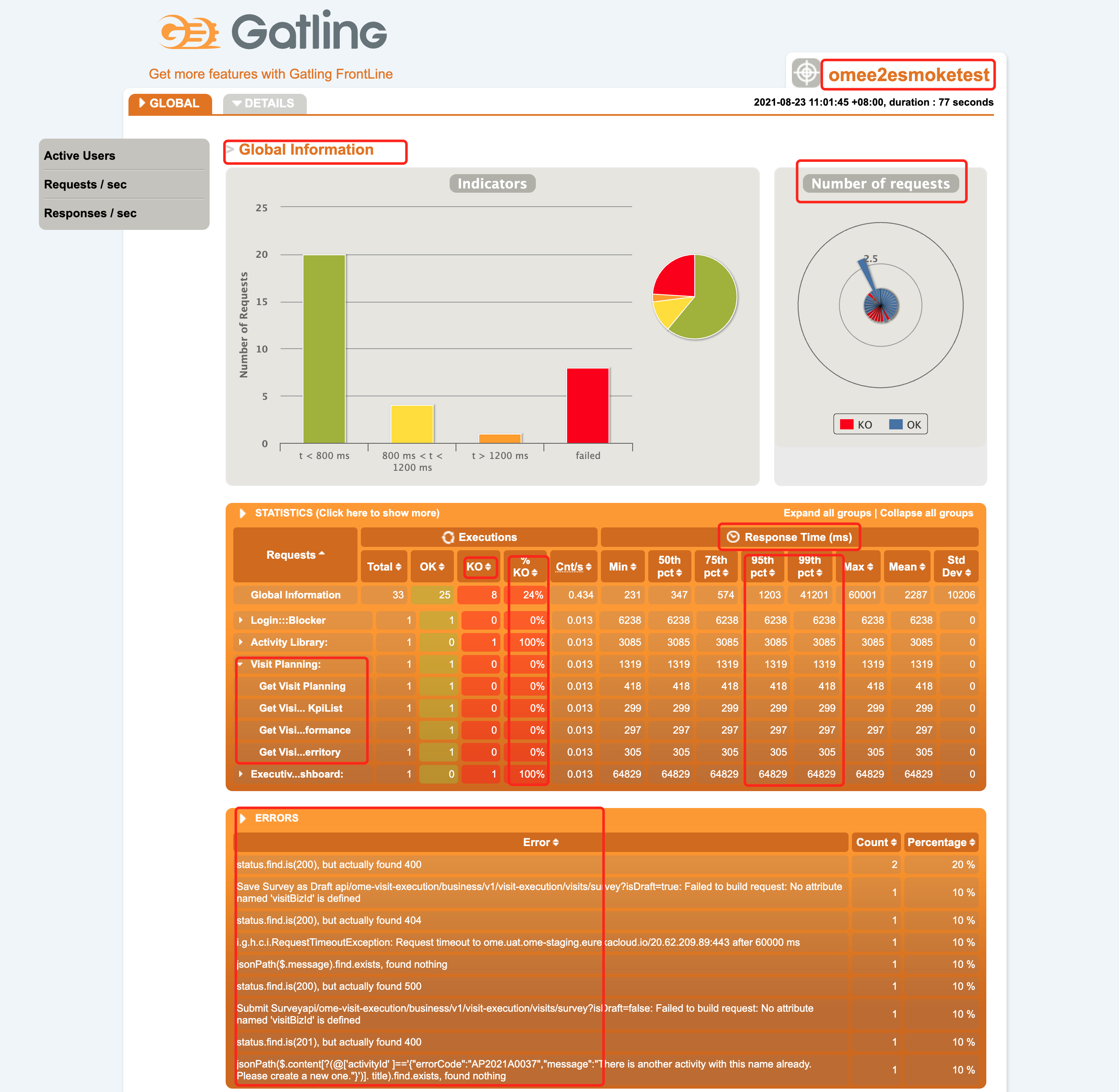 Gatling + Maven 性能测试(三)解读Gatling Report 一般本地运行完测试之后会在下图对应的目录下生成测试结果选中测试结果文件夹找到index.xml 文件,用浏览器打开打开之后你会看到下面这种图片:右上角显示你的Simulation的名字 Global information显示你所有的起请求以及请求响应的时间分布,红色代表失败的请求 右边Number of request一般代表你有多少用户并发 statisitics显示了所有请求具体的成功失败情况OK代表成功,KO代表失败,百分比99th pct代表对于这一个API总的请求...