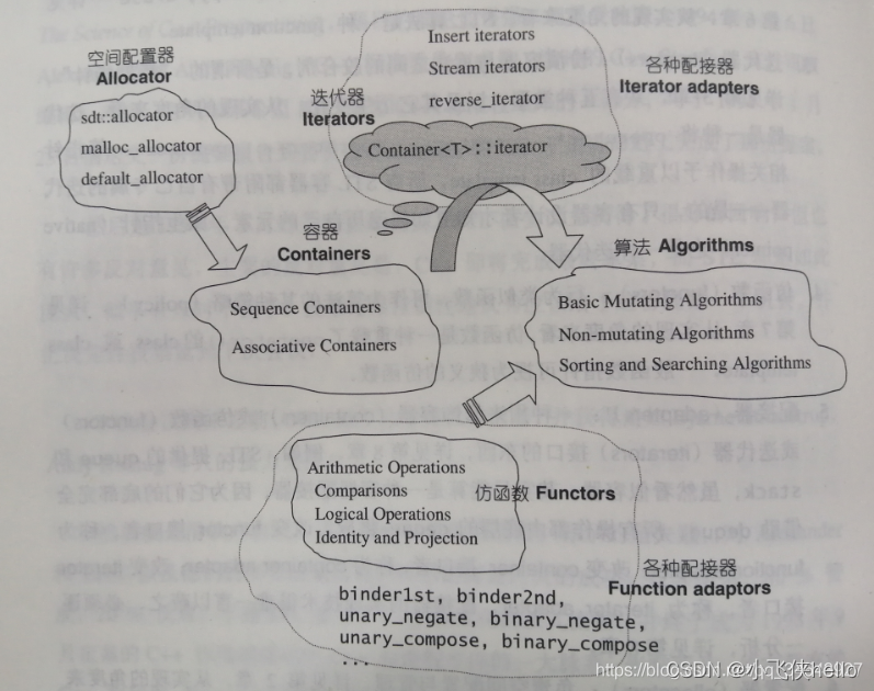 STL可分为容器(containers)、迭代器(iterators)、空间配置器(allocator)、配接器(adapters)、算法(algorithms)、仿函数(functors)六个部分。它们之间的关系可通过下图来说明。