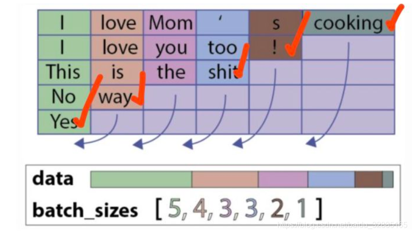 就是剔出padding字符后的hidden state和cell state,都是Variable类型的。代表的意思如下(各个句子的表示,lstm只会作用到它实际长度的句子,而不是通过无用的padding字符,下图用红色的打勾来表示):