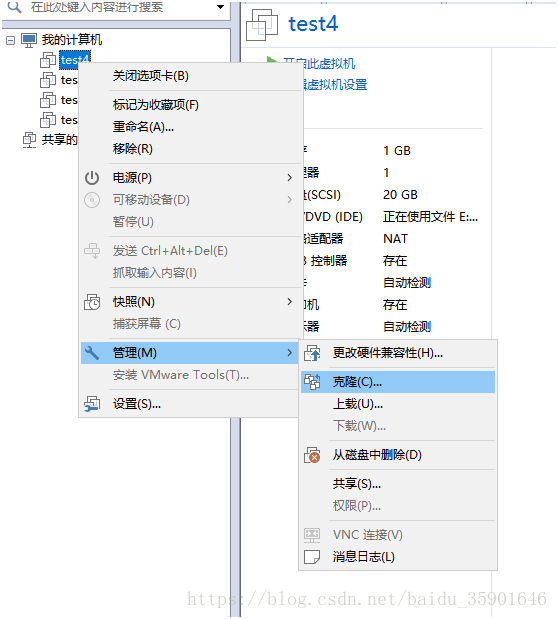 1.首先,寻找一台目标镜像,选中,右键单击选择“管理”--->“克隆”