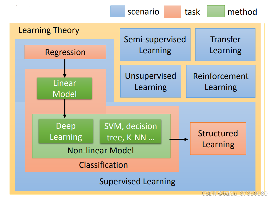 | 监督学习 | 包含分类和回归两大类,以及结构化学习(structured learning) | 每个样本都要包含标签数据 | 建立输入到输出的映射关系 |