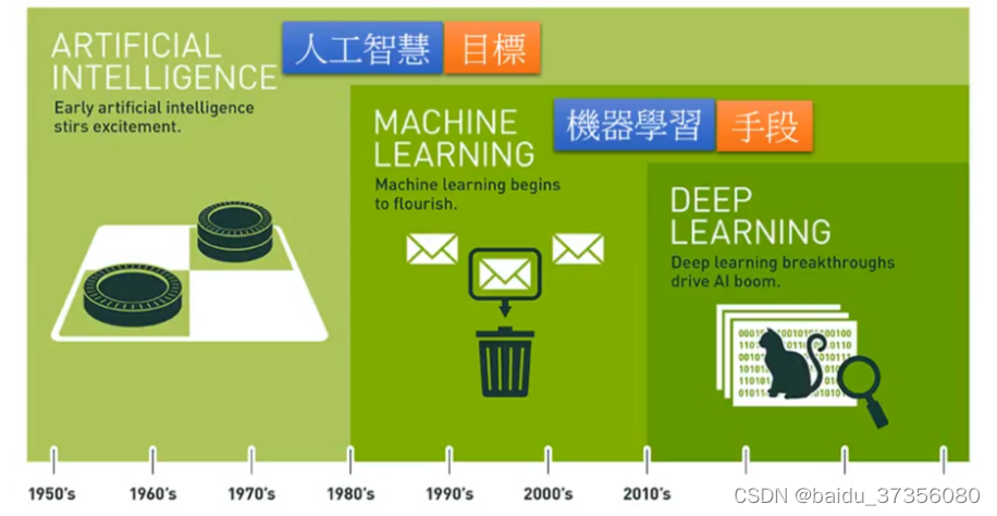 机器学习介绍#李宏毅机器学习Part1 目录概览相关技术和场景AI 训练师工作ref概览人工智能(人工智慧,artificial intelligence)是目标,机器学习是手段,深度学习是机器学习的一类。在整个machine learning framework整个过程分成了三个步骤。第一个步骤就是找一个function,第二个步骤让machine可以衡量一个function是好还是不好,第三个步骤是让machine有一个自动的方法,有一个好演算法可以挑出最好的function。相关技术和场景各类场景及.