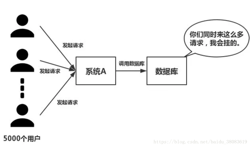 如下图所示,在大并发的情况下,所有的请求直接访问数据库,数据库会出现连接异常。