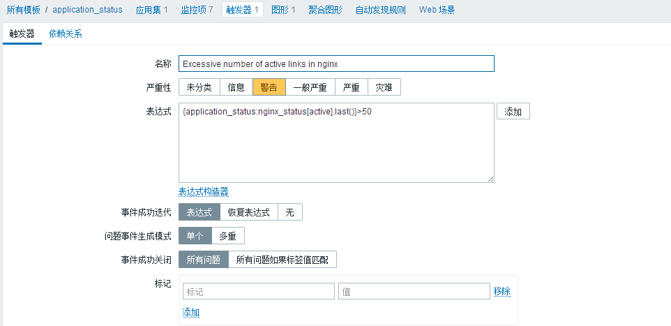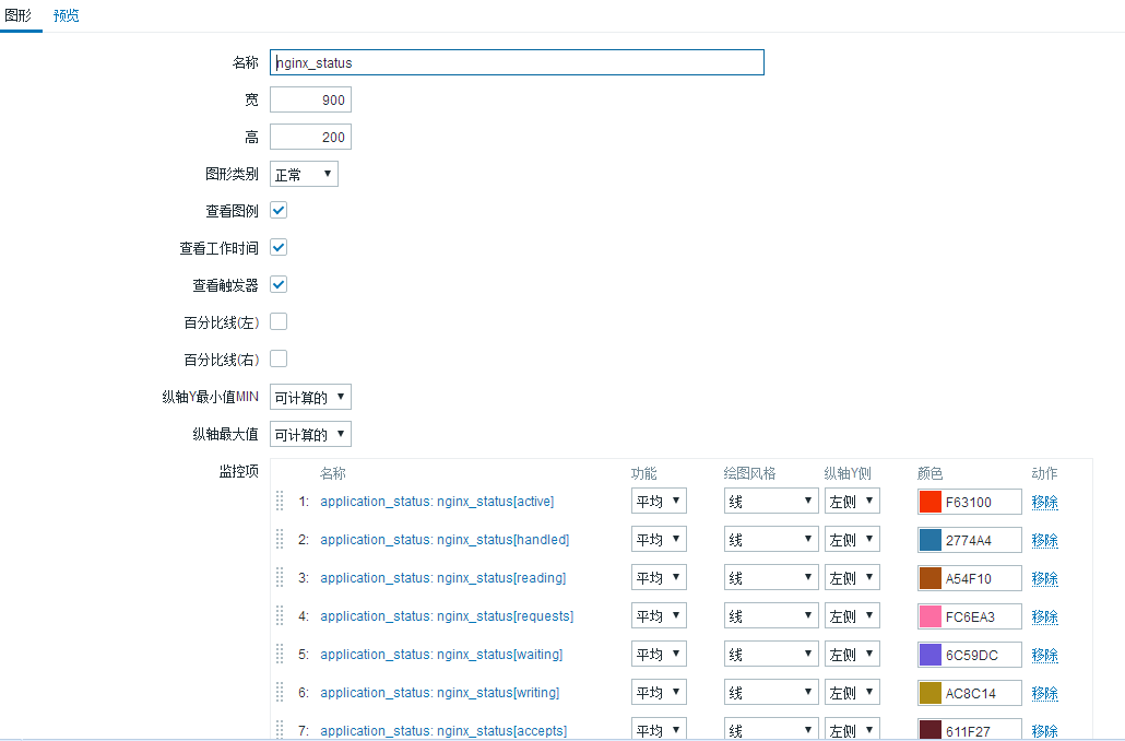 思路:定义application_status模板--->定义应用集nginx_status--->定义监控项---->定义图形--->定义触发器---->添加主机或主机关联这个模板