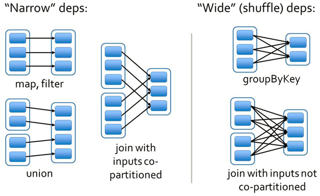 窄依赖的函数有:map, filter, union, join(父RDD是hash-partitioned ), mapPartitions, mapValues