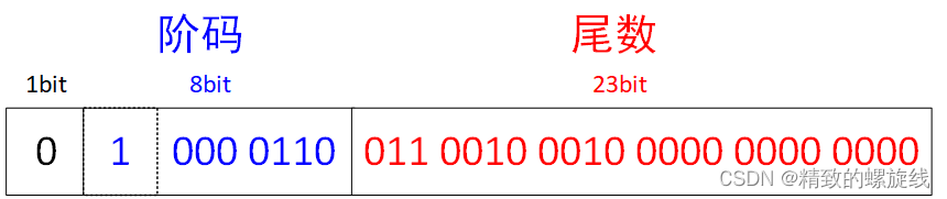 8bit为阶码j,其中包含一位的阶符。阶码用移码表示,IEEE规定阶码全为0时表示0,阶码全为1时表示无穷大。因此,这个移码的偏移值不是