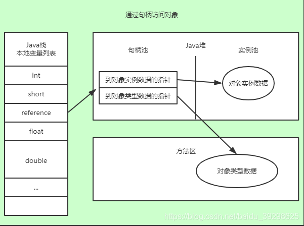 如果使用句柄访问,Java堆中将会划分出一块内存来作为句柄池,reference中存储的就是对象的句柄地址,而句柄中包含了对象实例数据与类型数据各自的具体地址信息。