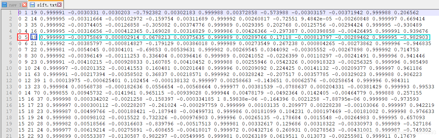 前两个是图像index,第三个是匹配对内点个数,后面的12个数构成4*3的pose姿态矩阵