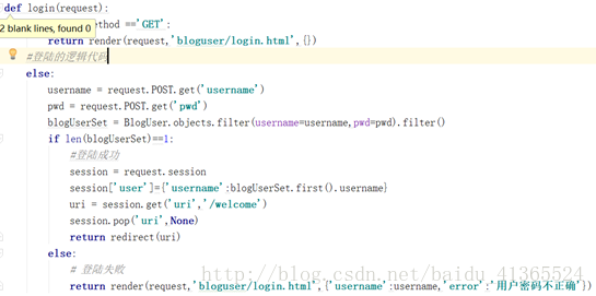 在bloguse/views.py中创建logout函数,在登陆成功后显示‘退出’,点退出的时候返回 welcome