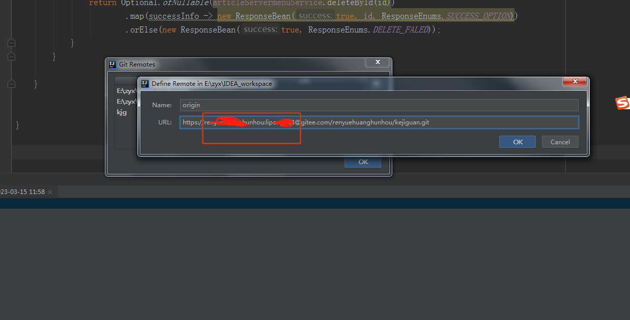 在git地址前面加上自己的码云账号和密码,我用红笔圈起来了,账号和密码中间有个“:”,别忘了啊!!