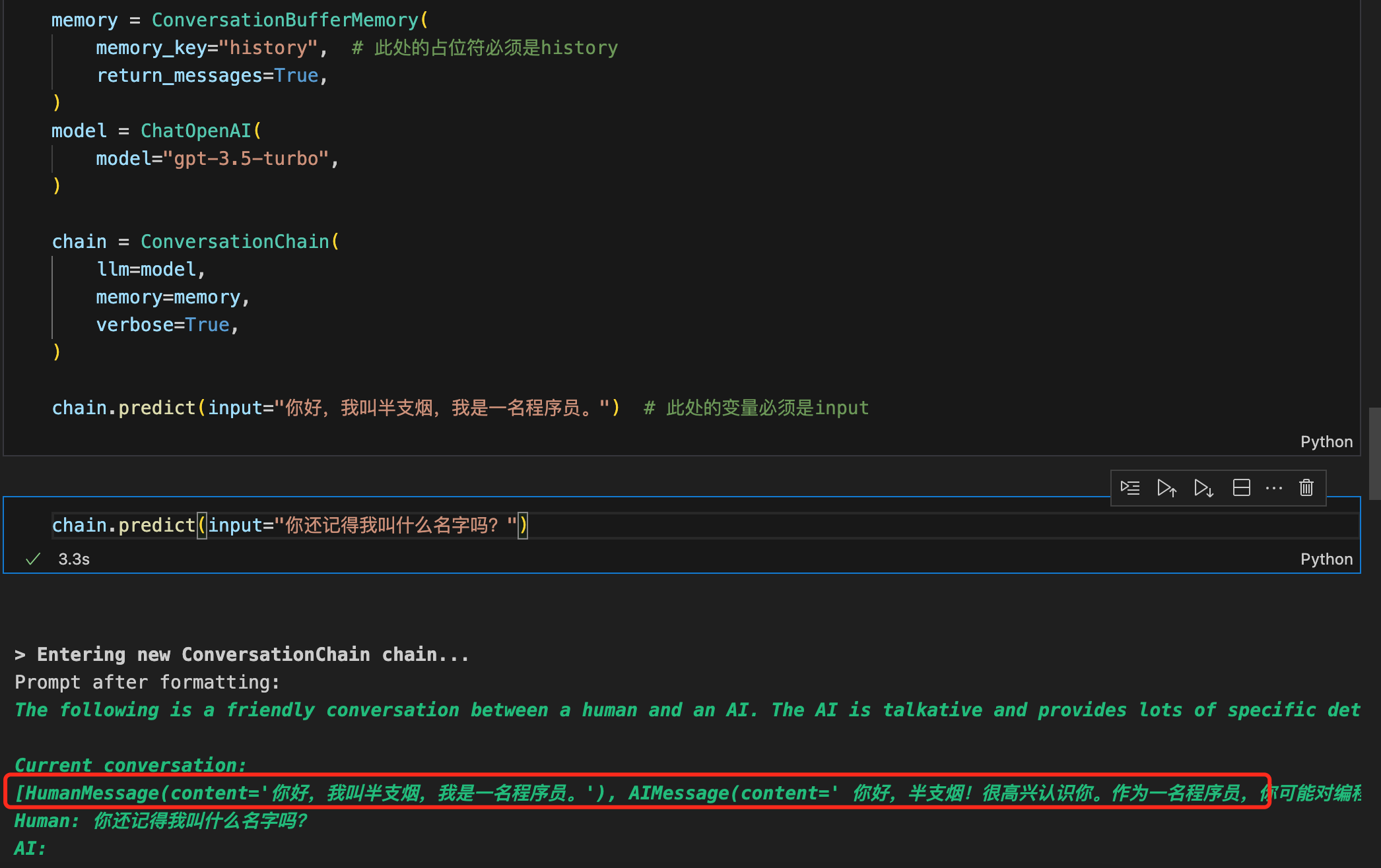 3.2. LLMChain+ConversationBufferMemory使用示例