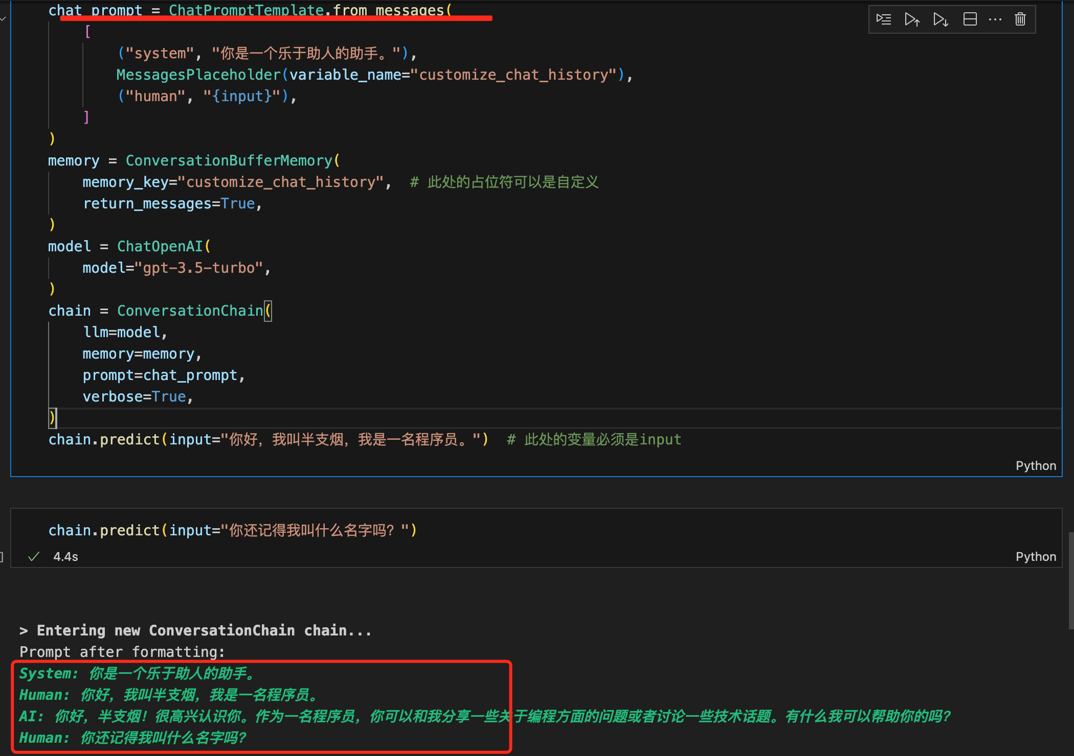 如果连ChatPromptTemplate都懒得写了,那直接使用对话链ConversationChain,让一切变得更简单。实践代码如下: