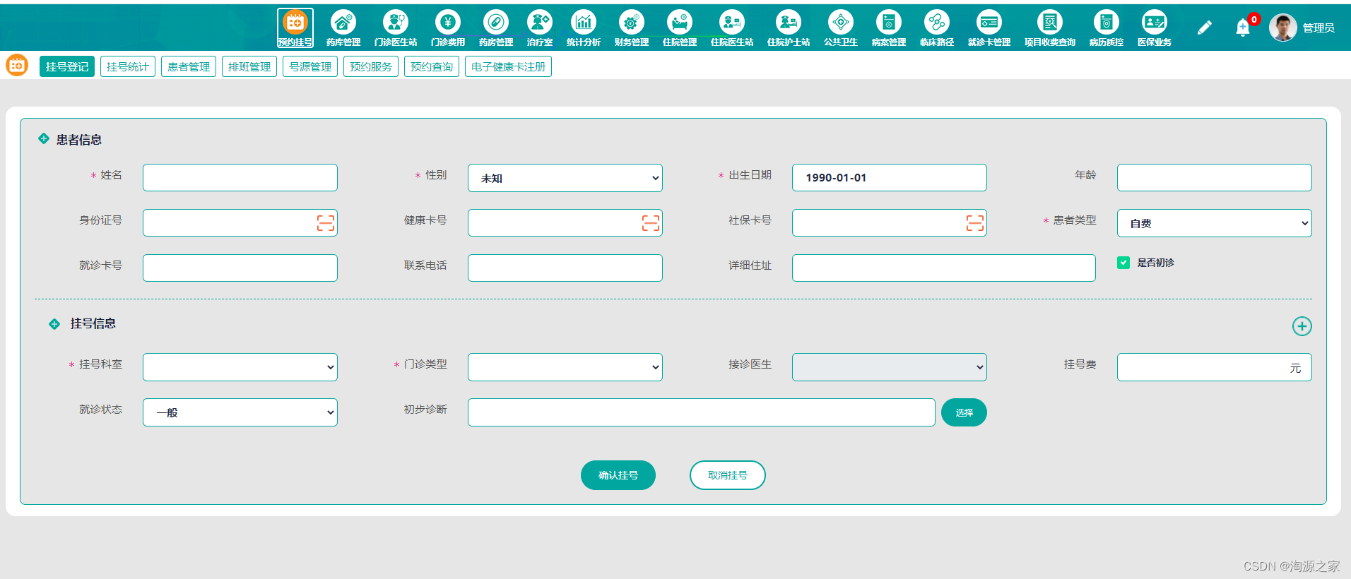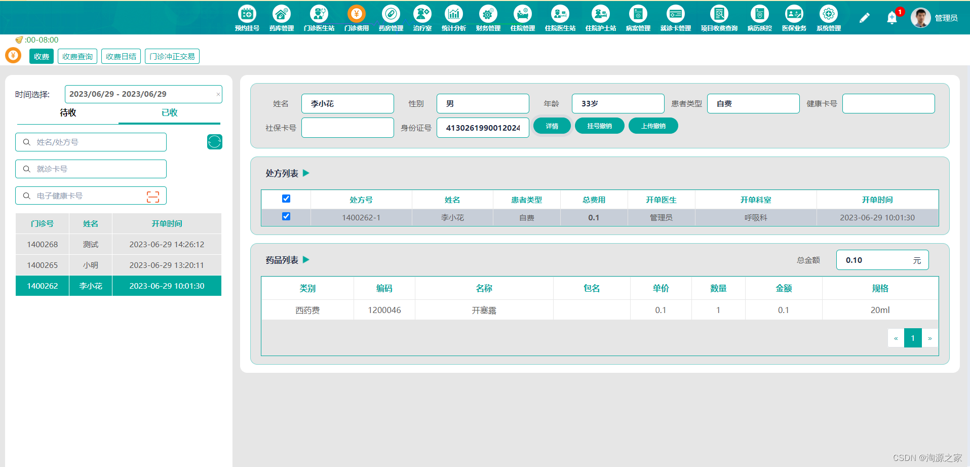 3.门诊管理:门诊挂号、门诊退号、门诊收费、门诊退费、发票补打、门诊日报