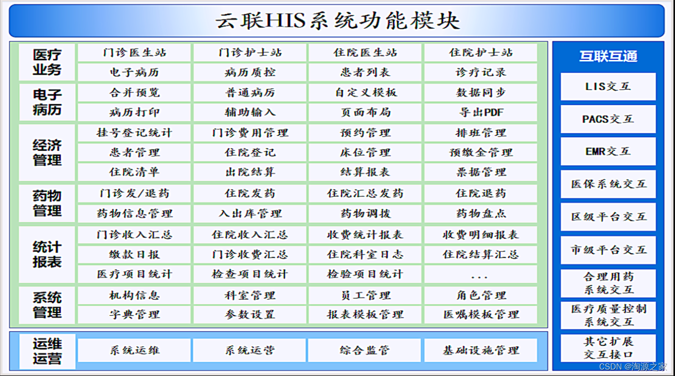 1.系统管理及基础数据:科室、病区、人员及其岗位、权限管理,各种基础资料、字典项目、模板、码表等管理,各种参数、配置
