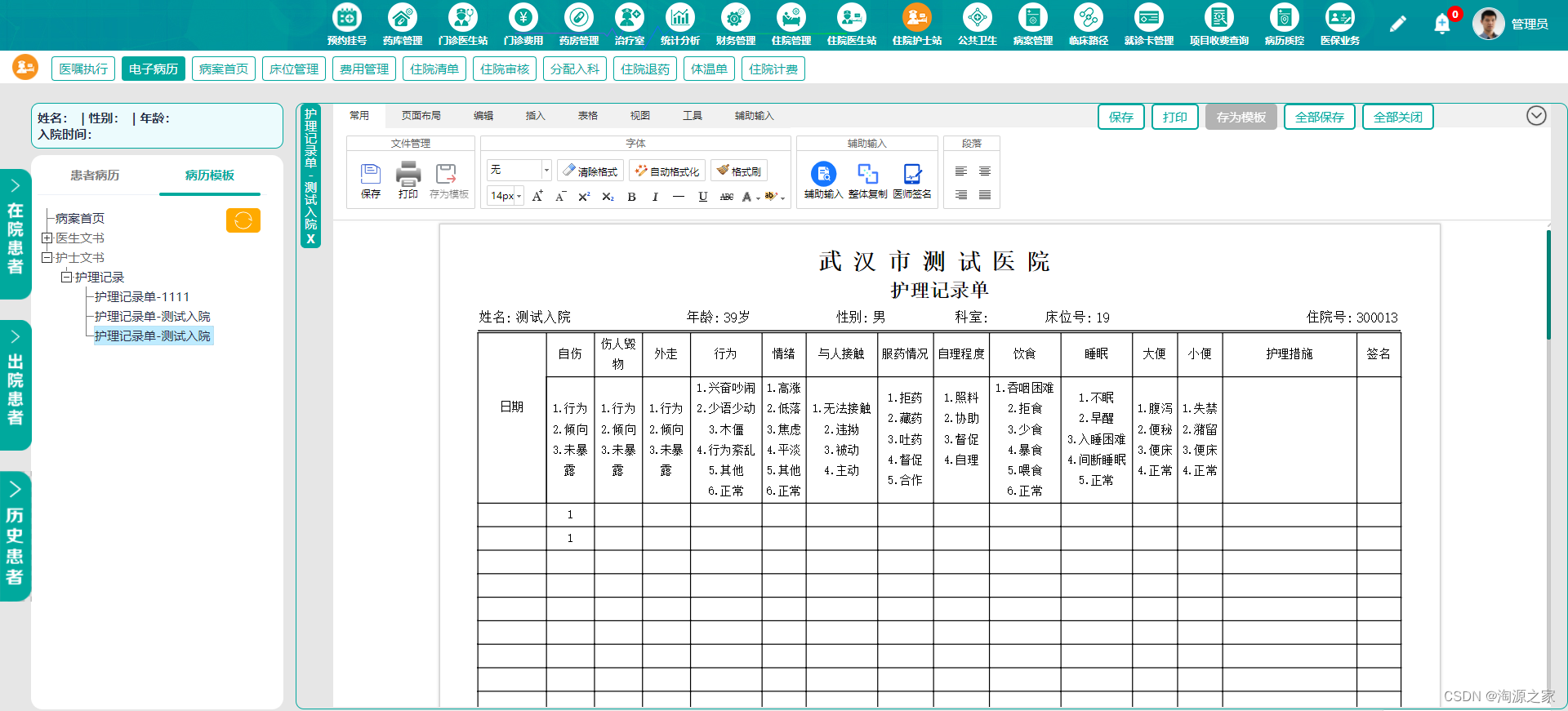 住院电子病历:住院病历及住院病程管理;住院病历模板、通过模板快速新建病历;住院护理记录管理;住院护理记录模板。