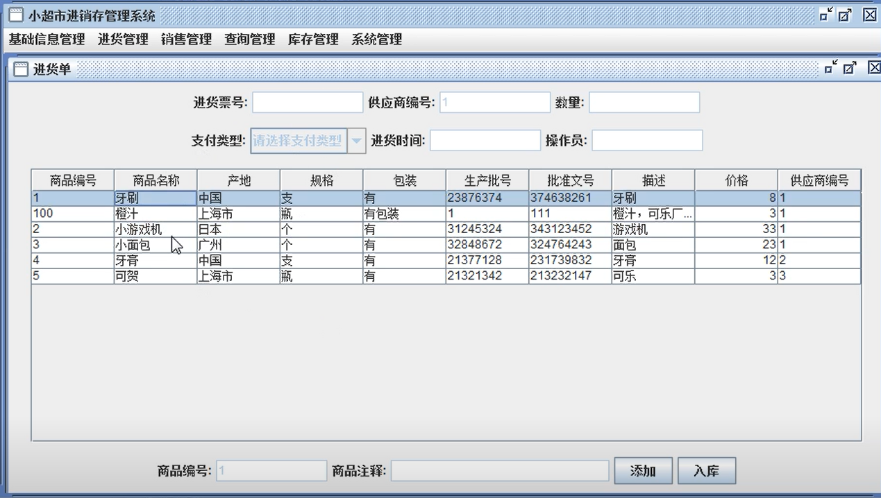 5 进货查询:查询历史上的进货信息。进货信息包括:商品类型、商品名称、数量、进货日期