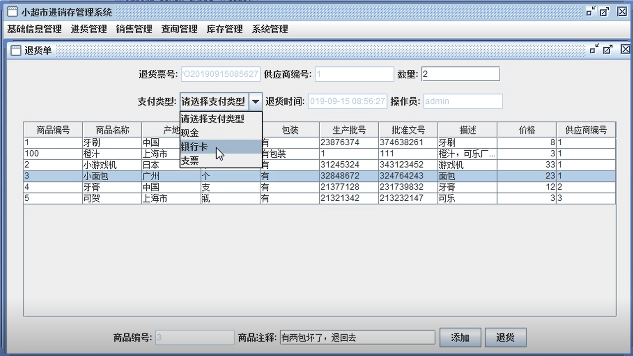 4 商品进货:进货信息包含类型、商品名称、数量等信息