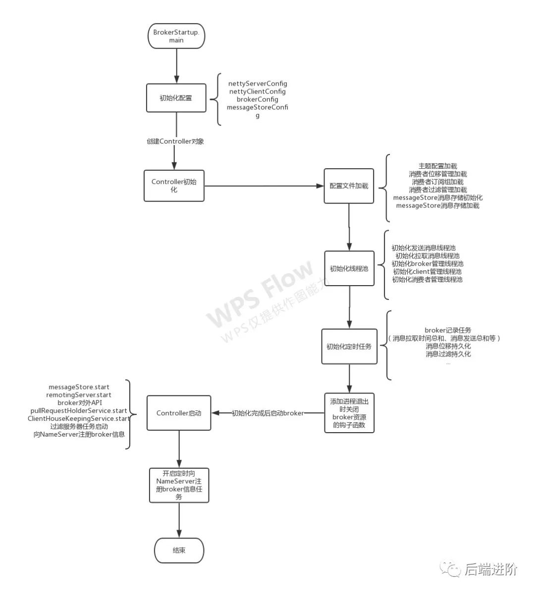 通过前面的分析可知,Broker的启动流程主要是先初始化4个配置文件,然后创建BrokerController对象,再调用initialize进行初始化,最后调用函数start进行启动。流程图如下: