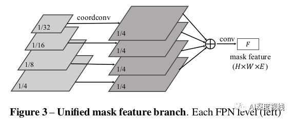 为了得到一个统一的、高分辨率的掩模特征表示,这里采用了基于语义分割的特征金字塔融合方法。重复3×3conv、group norm、ReLU和2×双线性上采样后,FPN特征P2到P5在1/4范围内合并为一个输出。最后一层由1×1卷积、group norm和ReLU组成。细节如图3所示。
