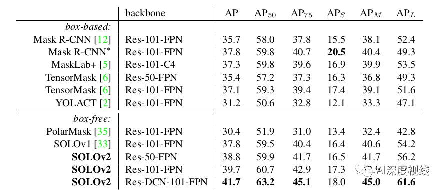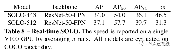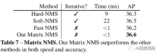 这篇文章,作者提出一种矩阵Matrix-NMS方法来节约这部分时间,实验表明该方法可以在1ms之内处理500个mask,还是用PyTorch的实现,比FAST-NMS还提升了0.4%的AP。