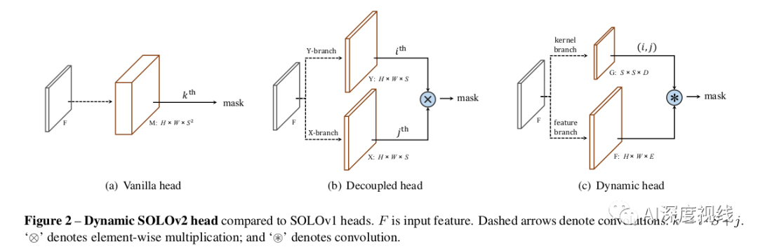SOLOv2很大程度上继承了SOLOv1的设定,例如grid cells,多尺度预测,CoorConv,以及loss function。不同的是,SOLOv2中引入动态方案,原来的Mask分支被解藕成Mask kernel分支和Mask feature分支,用来分开预测卷积核和卷积特征。