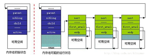 pool->ref = &parent->child;//将新建pool的自身指向指针ref 赋值为 &parent->child,即每新建一个内存池都保存到child里,而将原来的child内存池放到pool->sibling 链表中