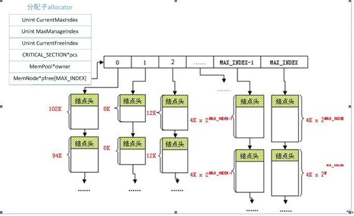 上文中讲到分配子allocator才代表了整个内存池中“池”的概论,首先讲pfree[MAX_INDEX],这是一个内存结点指针数组,先将内存结点理解为固定大小的内存块,allocator像是内存的批发商,内存结点都是较大的具有固定大小的内存块。pfree[MAX_INDEX]数组的每个元素都指向一个内存结点MemNode的链表,提供给内存池结点申请使用,除0索引下面挂的内存结点,其他元素下面挂的内存结点大小都相同,数组索引号与每个索引号对应内存结点大小的对应关系为 内存结点大小=4K*(index+1),例如索引号为1,结点大小则为8K,索引号为2结点大小为12K,依次类推,MAX_INDEX为宏定义,一般等于20,表示数组索引号的最大值,索引号1~MAX_INDEX下面挂的结点大小相同,称为规则结点;索引号0下挂的内存结点大小都大于4K*(MAX_INDEX+1),且内存结点大小不一定相同,称为不规则结点;采用数组索引的方式是为了方便存取,增加存取速度。当申请内存时,先将申请的大小转化为index值,然后直接根据index大小去在数组的索引号下查找是否有结点,先在索引1~MAX_INDEX下查找规则结点,如果没找到,则在0索引下查找,如果index超过MAX_INDEX,则直接在0索引下查找,如果都没找到则直接从系统申请。例如需要一个12k的内存结点,索引号为2,则在pfree[2]指针下查找是否有12K的结点,如果有则返回12K结点,如果没有则在pfree[3]下找16k的结点,一直到pfree[MAX_INDEX],以最合适的结点为原则,尽量使用allocator里已经挂载的内存结点,避免从系统去申请,16K的内存块给内存池结点去支配,也不会浪费。
