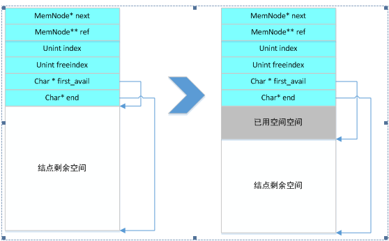 内存结点的结构如图所示,next指向下一个内存结点,形成链表,ref为指向自身的指针的指针,指向上一个结点的next指针,上一个结点的next指针指向本节点;index大小固定,表示该结点总大小的索引值;free_index大小随着结点空间使用而减小,表示剩余空间索引值的大小,active链表中会根据这个值进行排序,大的在前,小的在后;first_avail指针指向可用空间的头部,endp指向可用空间的尾部;