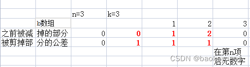 如图这样一个样例,n=3,k=3,b为1 2 3,于是得到这样一串数字。其中红色粗体的便是本算法的关键。所以,我们的新代码思路就此产生——二次差分!
