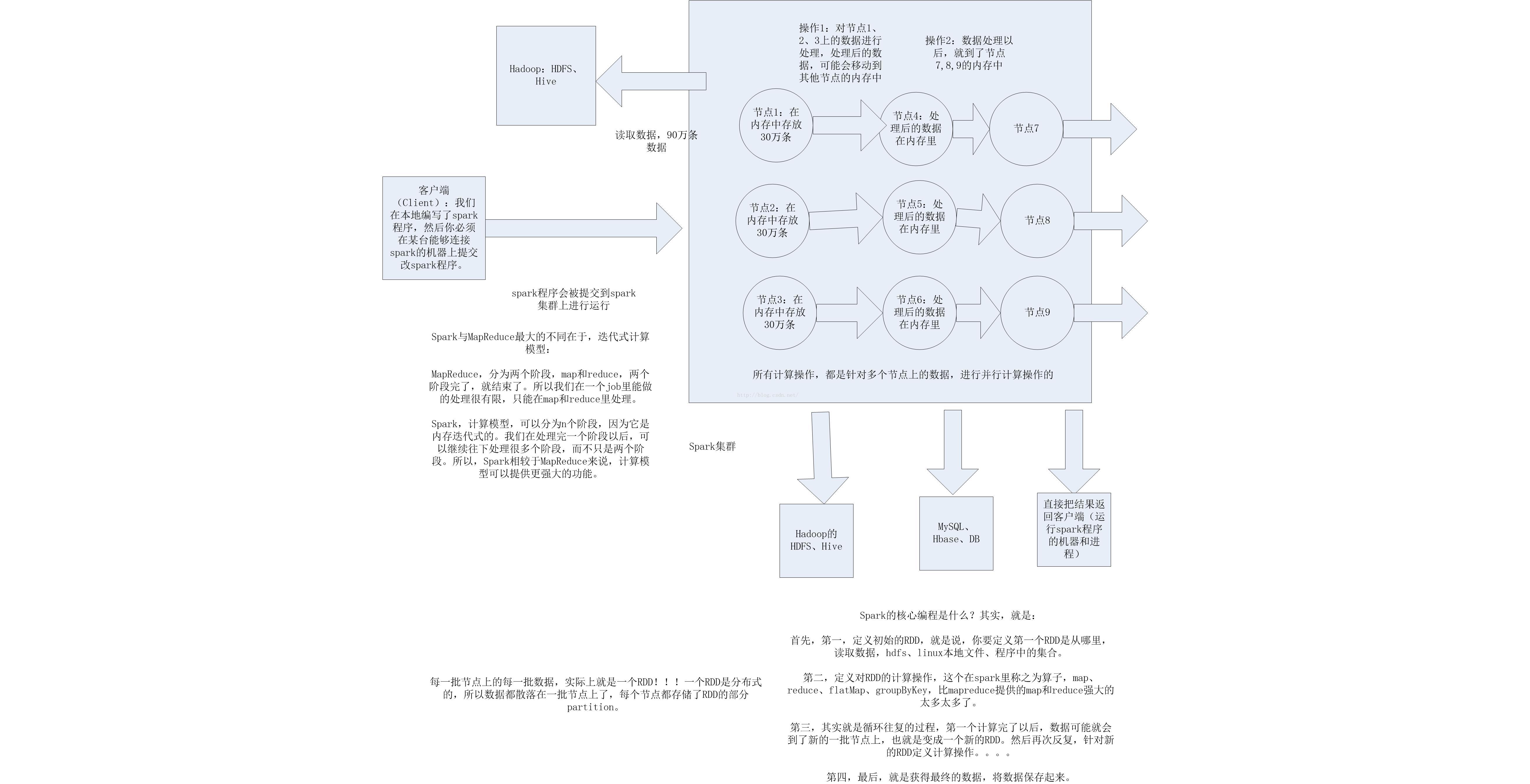 第三,其实就是循环往复的过程,第一个计算完了以后,数据可能就会到了新的一批节点上,也就是变成一个新的RDD。然后再次反复,针对新的RDD定义计算操作。。。。