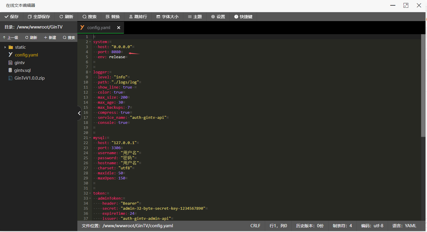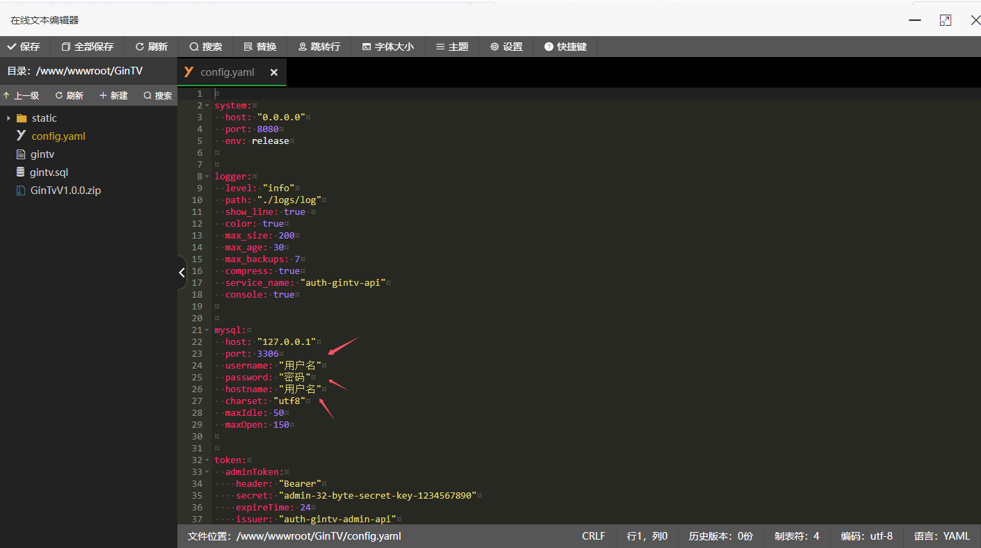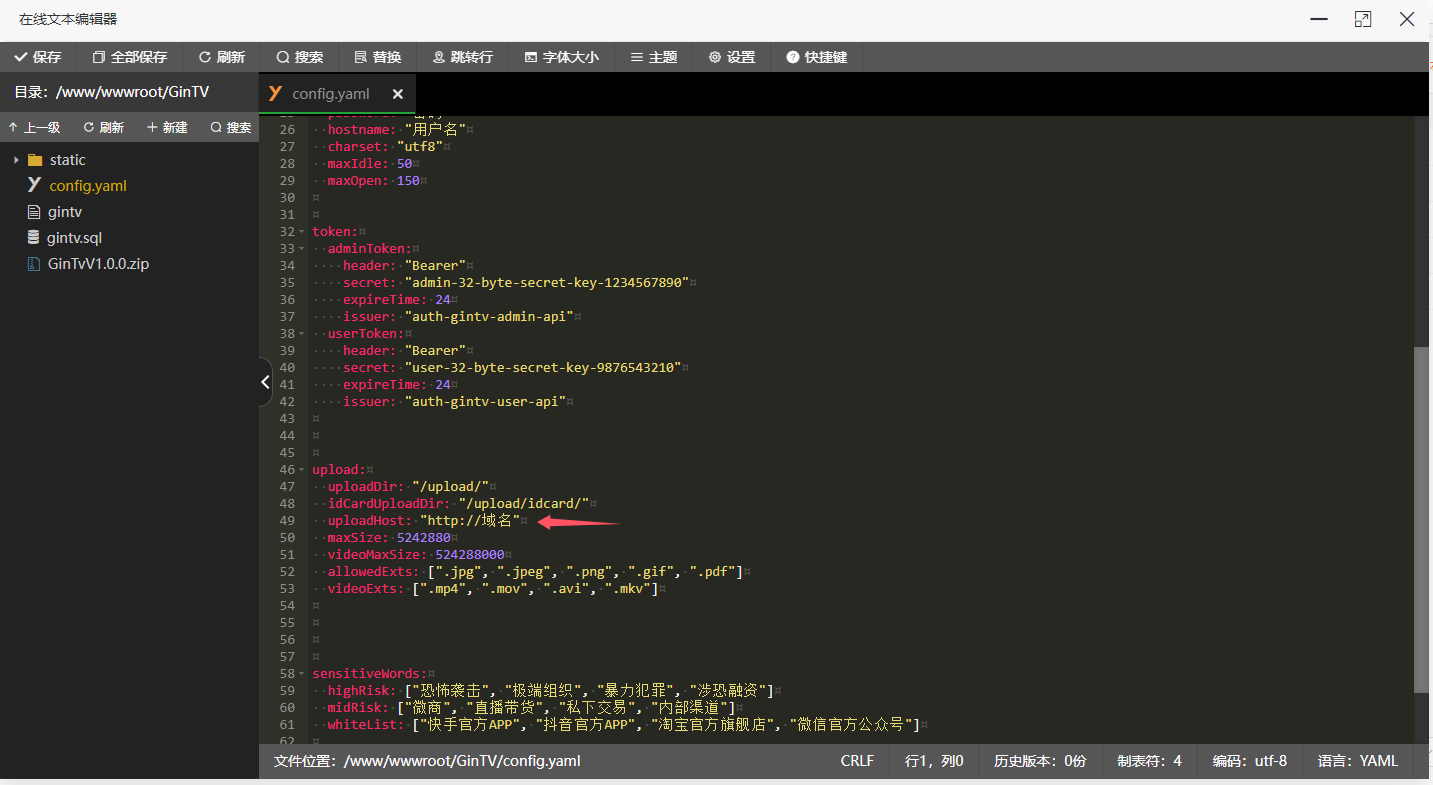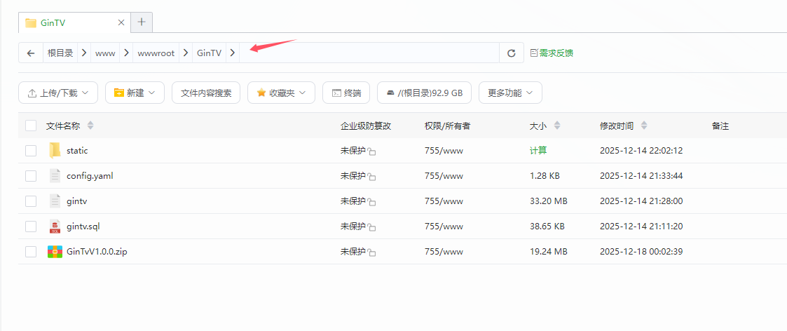 程序解压好了之后,我们就去上传gintv.sql,导入数据之后