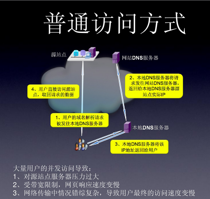 对于普通的Internet用户来讲,每个CDN节点就相当于一个放置在它周围的WEB。通过全局负载均衡DNS的控制,用户的请求被透明地指向离他最近的节点,节点中CDN服务器会像网站的原始服务器一样,响应用户的请求。由于它离用户更近,因而响应时间必然更快。