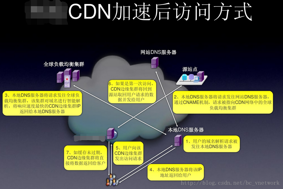 CDN网络是在用户和服务器之间增加Cache层,如何将用户的请求引导到Cache上获得源服务器的数据,主要是通过接管DNS实现,下面让我们看看访问使用CDN缓存后的网站的过程: