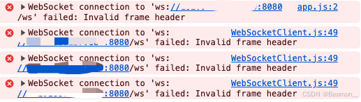 代理问题,新配置的接口代理,影响到了项目内置的本地服务代理配置,参考Websocket connection failed, Invalid frame header · Issue #1850 · vuejs/vue-cli · GitHub