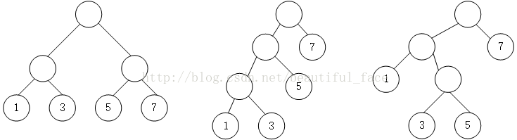 例子:有4个权值(1,3,5,7),利用这4个权值作为叶子结点构造二叉树