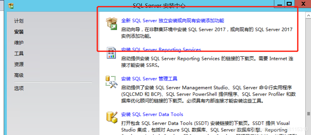 点击安装,在点击全新SQL server独立安装或向现有安装添加功能
