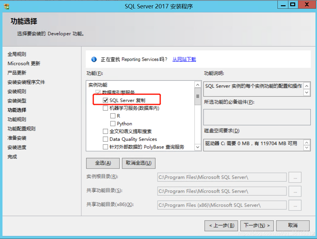 选择向sql server 2017的现有实例添加功能,然后下一步