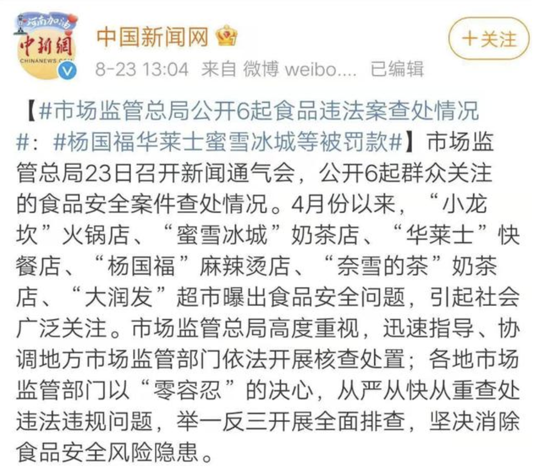 同期,广东、上海、河北、内蒙古、黑龙江、辽宁、江苏、浙江、安徽、山东、河南等11个省(自治区、直辖市)市场监管部门全面排查了辖区内杨国福麻辣烫门店3323家,责令整改841家,警告5家,立案查处24件。