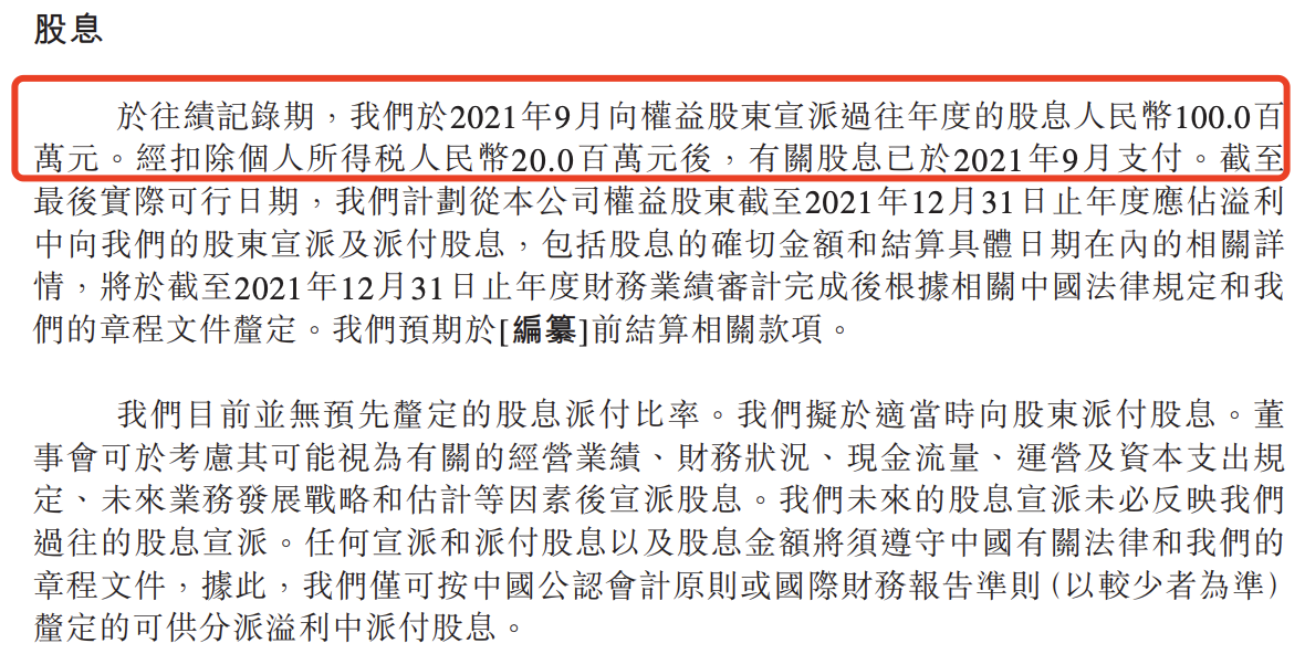 值得一提的是,杨国福的管理层还在该公司上市前进行了紧急“套现”。招股书显示,杨国福在2021年9月向权益股东宣派了人民币1亿元的股息。经扣除个人所得税后2000万元后,有关股息已于2021年9月支付。