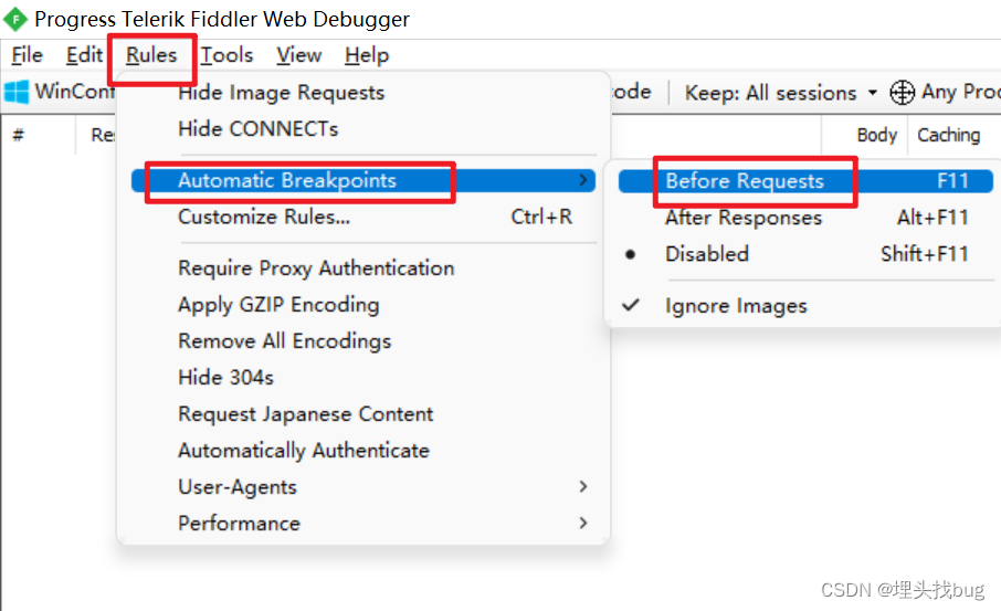 Fiddler断点 Rule——Automatic Breakpoints——After Responses(Alt+F 11)或选中请求点击All Processes后面的空白处,出现红色的T。Rule——Automatic Breakpoints——Before Requests(F11)或选中请求点击All Processes后面的空白处,出现红色的T。例如:bpafter login:取消断点:再输入一次bpafter login。例如:bpu login 取消断点:再输入一次bpu login。