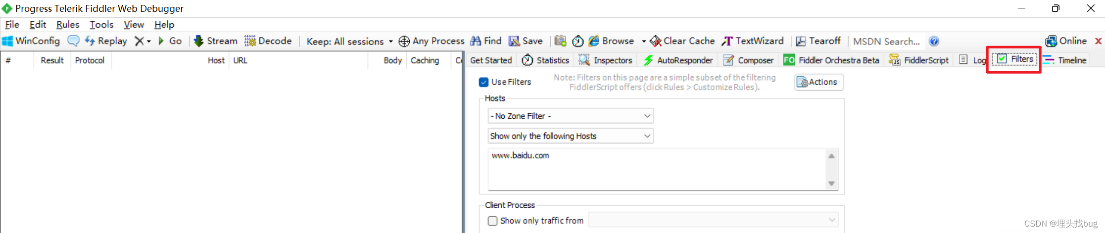 Fiddler只获取指定http的包 Show only the following Hosts——只显示下面输入的主机名的会话。Hide the following Hosts——隐藏下面输入的主机名的会话。Flag the following Hosts——标记下面输入的主机名的会话。Show only Intranet Hosts——只显示内网主机。Show only Internet Hosts——只显示外网。No Zone Filter——这个默认,不过滤内外网。No Host Filter——这个默认,不过滤主机名。