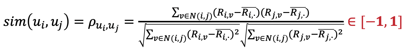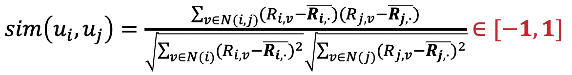 此外,他们分母上使用的评分集范围也不同。修正的余弦相似度使用的是对象各自的评分集,因为它计算的是评分向量各自的模长;而Pearson相关系数采用的则是两个对象的共同评分集,因为Pearson相关系数处理的两个变量得是一一对应,得是非缺失值。