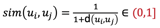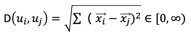 又称欧式距离。对于任两个用户ui和uj,欧式距离就是计算这两个用户的评分向量在n维向量空间中的绝对距离,计算公式如下: