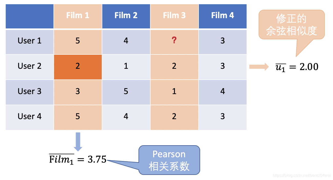 即使是在计算项目间相似度时,修正的余弦相似度所减去的均值仍是对该项目打过分的每个用户u,其评分均值;而Pearson相关系数则是减去该项目所获得的打分的均值。举个例子: